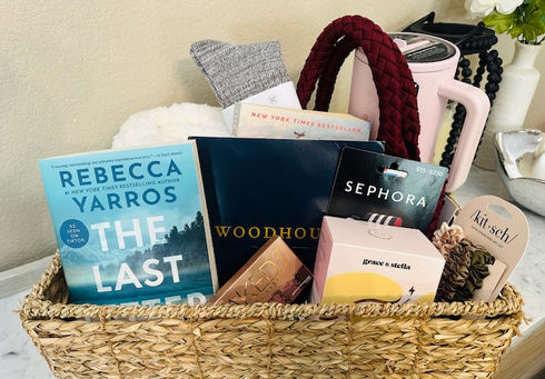 Hydro Jug, Calia Tote, Ugg Socks, Urban Decay Naked 3 Mini Eyeshadow Pallet,Grace and Stella Eye Patches, Kitsch Scrunchies,Bedsure Throw Blanket, Book (The Last Letter) Book (The Paris Library) $50 Sephora Gift Card, $50 Woodhouse Gift Card